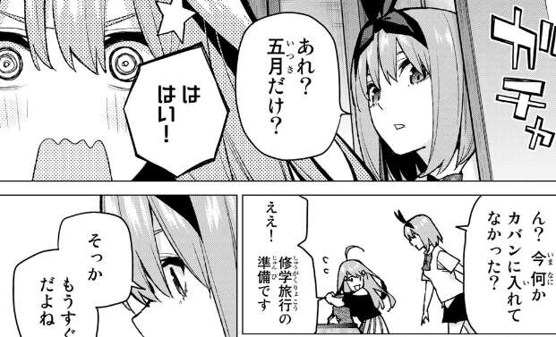 前回、修学旅行の班決めが終わり、いよいよ修学旅行直前となりましたが、五月はカバンに何かを準備しています。そこに四葉が現れて、最近 五姉妹の雰囲気が悪いのでまた仲良くなりたいと言い、五月もそうですねと言います。