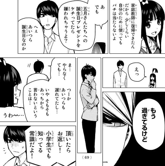 一方、上杉家の風太郎とらいはは修学旅行に向けて日用品を新調しています。そこでらいはは風太郎に五つ子たちへの誕生日プレゼントをケチらないように注意します。しかし風太郎はそもそも誕生日を知らず、しかも誕生日が過ぎている事を指摘したら開き直り、らいはを引かせます。