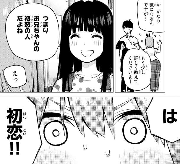 問い詰められた風太郎は正直に京都で昔、偶然出会った女の子だと言いますが、らいはが初恋の人だとばらしてしまい、驚く四葉です。詳しく聞こうとする四葉ですが、お腹が空いたとらいはが言うと、すぐにらいはの相手をし始めて二人で食べ物を買いに行ってしまいます。