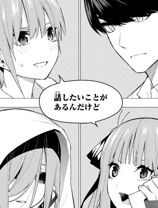 さらに三玖から二乃のスマホに電話があり、やっと二乃と三玖は話が出来ます。そして一花は風太郎に、二乃は三玖に明日、話したいことがあると切り出したところで、今週は終わりです。