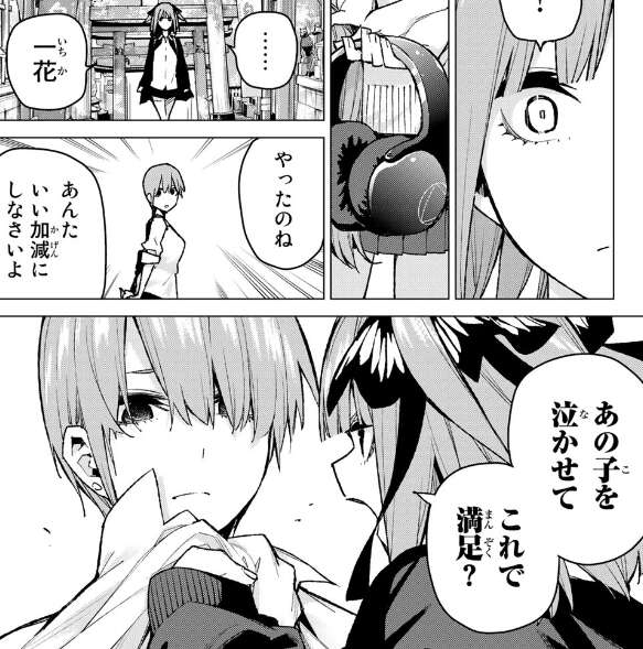 そこの場にやっと追いついた二乃ですが、一花がヘッドフォンを持っているのを見てしまいます。一花が何をしていたのか察したのか、二乃に掴みかかりこれで満足かと問い詰めます。しかし、一花も二乃が温泉で他人を蹴落としても自分の恋を叶えたいと言っていたのと、何が違うのかと反論します。しかし二乃は自分達五つ子の絆も同じくらい大切だと言います。