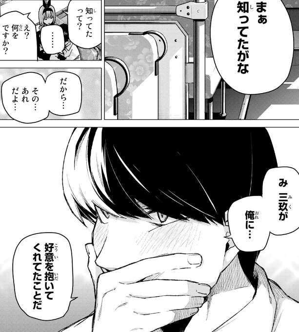 風太郎は三玖を追いかけますが、既に三玖はバスで移動してしまったようで、風太郎は追いつけません。四葉に、三玖は五月と一緒に移動していると教えてもらった風太郎は、四葉と一緒にバスで追いかけます。そのバス内で四葉に、山頂で三玖が風太郎に告白しようとしていると言った事、聞こえたか確認しますが、風太郎はバレバレの嘘でごまかそうとします。