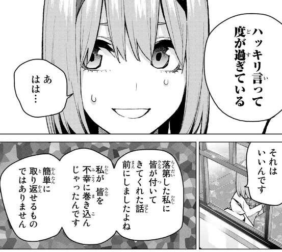 そして三玖の事で責任を感じている四葉に、人に気を遣いすぎると注意します。しかし、四葉以前の学校で自分が落第した時、他の四人が付いてきてくれた事を気にして、は姉妹の皆が自分より幸せになるのは当然だというのが、四葉の考えです。四葉は皆が幸せになる方法はないんでしょうかと言いますが、風太郎は現実的には難しい何かを選ぶときは、何かを選ばない時、いつかは決めなくちゃいけない人来ると言います。