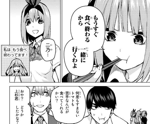 部屋に行こうとする四葉を二乃は止めて、食べ終わったら一緒に部屋まで行こうと二乃は話します。五月は既に食べ終わっていますが。一方、風太郎は三人を気にしながらも、武田と仲良く食事中で、武田の苦手なものを代わりに食べてあげているようです。