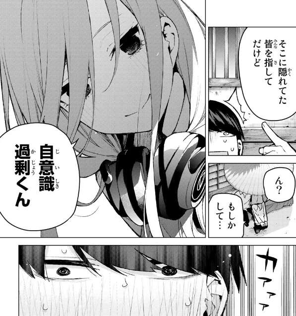 もしかして自分の事だと思った?自意識過剰くん、と三玖は言い風太郎をからかいます。顔を真っ赤にして怒り、その場を立ち去る風太郎です。四葉は三玖にせっかく想いを伝えたのに、ごまかしていいのかと心配されますが、三玖は風太郎がそこまで鈍感じゃないと言い、風太郎も三玖の思っている事は察してくれているようです。