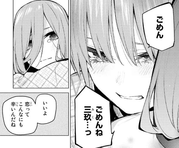 三玖は二乃たちに裏からフォローしてくれた事に礼を言い、一花にも礼を言おうとしますが一花は三玖に改めて謝罪をします。三玖もいいよと言って、恋ってこんなに辛いんだねと呟きます。