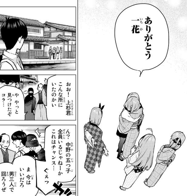 色々ありましたが、三玖は一花にありがとうと言い、全員仲直りできたようです。風太郎は前田、武田と合流し男だけで映画村を回ったり連絡先を交換したりと、こちらも男同時で楽しんだようです。