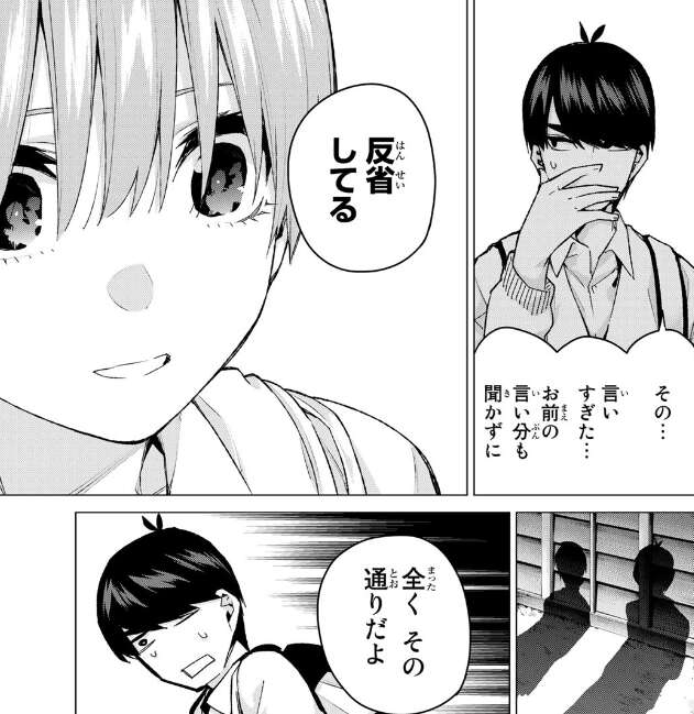 その後、集合場所に集まる前に風太郎の所に一花が来て、風太郎に改めて迷惑をかけたと謝ります。風太郎も一花に言いすぎたことを謝ると、一花は風太郎を最初からかって私はすっごく悲しかったんだと言います。