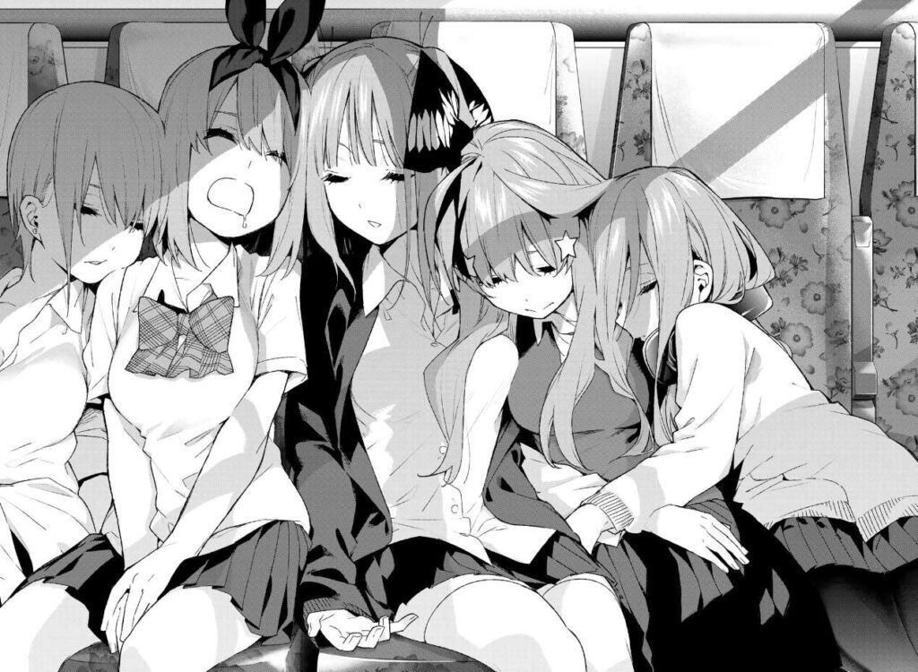 土砂降りの雨は止み、雨が上がった後の土はより固くなるはずだ、の言葉通り五つ子たちの仲はより良くなったようで、バスの中で五人仲良く爆睡しています。そして、その場面を風太郎は写真に収めます。