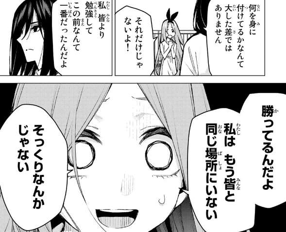 風太郎の行動にあきれる四葉ですが、風太郎の家が貧乏と分かりお金が無くて辛くないかと質問します。五つ子たちもこの頃は母親一人で五人を育てていて貧乏ですが、四葉はお金がないのは辛くないが母親が一人働いている姿を見るのは辛いと言います。そして自分がいなければもっと楽だったのにとも四葉は言い、だからこれからはたくさん勉強して賢くなっていいお給料の会社に入って母親を楽にさせてあげる、そうすればきっと私がいることに意味ができると思うんだと四葉は言います。