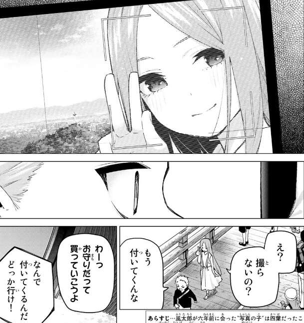 前回、小学生の頃の風太郎が京都の修学旅行で盗撮騒動に巻き込まれていたところを、四葉が助けます。そのまま京都での修学旅行を一緒に観て回っていますが、風太郎は四葉について来ないように言っています。