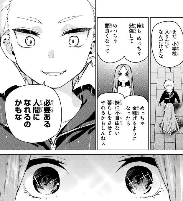 四葉の考え方に感心して共感した風太郎は自分も妹の為に、めっちゃ勉強して頭よくなってお金を稼げるようになり、妹に何不自由ない暮らしをさせたい、必要ある人間になれるかもと言います。四葉は感動したのか風太郎の手を握り、二人で頑張ろうと誓います。