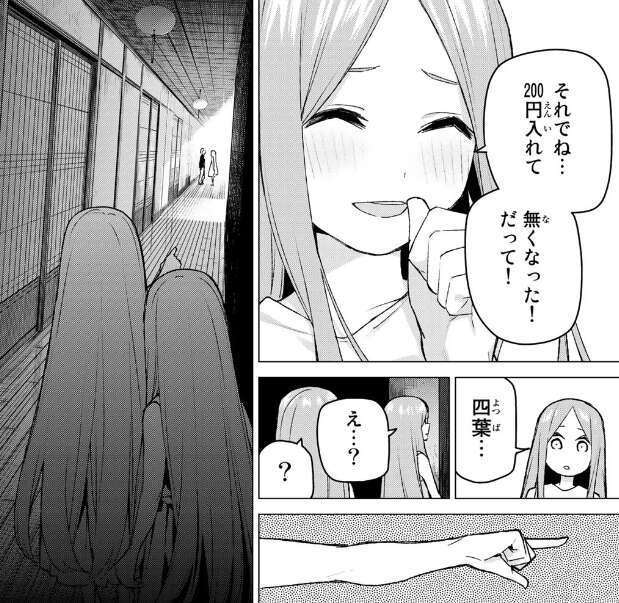 無事、四葉は旅館に戻り二乃に風太郎の事を話しています。嬉しそうに風太郎の事を話し、風太郎の学校の先生が迎えに来るまでもう一度会いに行くと言いますが、その風太郎はいつの間にか一花と出会っていて、楽しそうに会話しています。