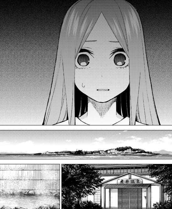 一花と風太郎が楽しそうにしているのを見た四葉、複雑そうな表情をしています。そして場面は変わって、虎岩温泉の旅館です。修学旅行が終わって温泉旅館に旅行に来たようですが、会話内容から五つ子たちの母親がこの頃から、病気から体調をずっと崩しているようです。
