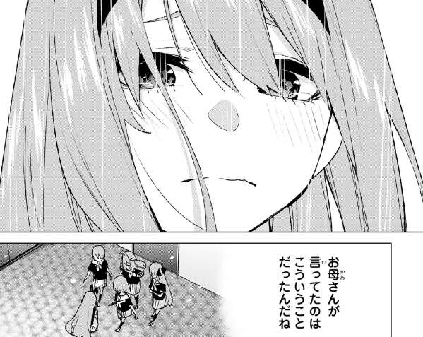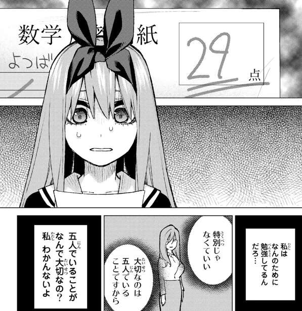 しかし、四葉はたくさん勉強をしてもなかなかいい点数が取れず、次第に何のために勉強をしているか、母親が言っていた五人でいることが何で大切なのかが分からなくなってきます。