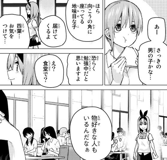 五人全員で転校した五つ子は食堂で美味しそうに食事をし、ここの食堂のレベルが高いと会話をしています。二乃は試験とかもゆるそうで、そんなに必死に勉強しなくてもよさそうね、転校して正解だったわと四葉をフォローします。四葉が二乃のフォローに嬉しそうにしつつ、視線を外すと誰かのテスト用紙が落ちている事に気付きます。四葉は100点のテスト用紙を見つけ、一花から角で座っている地味な男の子のかもと聞くと四葉はテスト用紙を届けてくると言います。四葉は食堂で勉強中と聞き、物好きな人もいるんだと思いながら男の子に近づいていきます。
