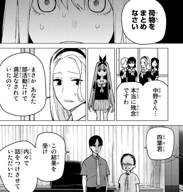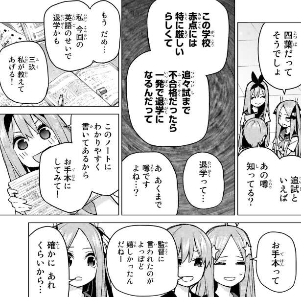 一方、一花は中学生になり部活の邪魔だからと髪をショートカットにしています。二乃や三玖は似合っていると褒めますが、四葉はお喋りを止めさせ追試対策に勉強をしようと四人に話しかけます。黒薔薇女子は赤点に特に厳しく、追々試まで不合格だと一発で退学になるという噂があると一花が話しみんな驚いています。三玖は英語が苦手で弱音を言いますが、四葉が自分のノートをお手本にしてみてと言います。