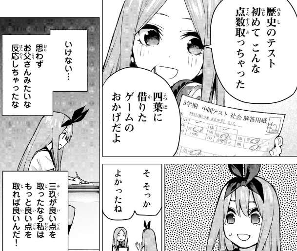 次のテストでも四葉は頑張って31点を取り、その場ではある程度満足していましたが、一方ゲームで歴史の知識に詳しくなった三玖は四葉を超えて42点を取ります。思わず複雑な表情をする四葉ですが、すぐに気を取り直してたくさん勉強をしてもっと良い点を取れば良いんだと思います。