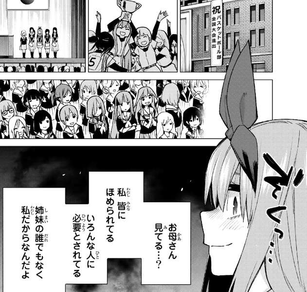 今回は黒薔薇女子の中学、高校時代のお話でした。四葉は特別にならなければと考え、勉強を頑張りますが、結果が31点とほとんど成果が出ず中学時代は悩みます。しかし高校時代は部活でスポーツの才能を開花させて、皆からも褒められて満足しています。が、この辺りの四葉は三玖に冷たく接したり、表彰されている自分を特別扱いしたりと、性格が少々悪くなっていて周りが見えていない感じです。結局三玖の助言も聞かず勉強をおろそかにした結果、黒薔薇女子での落第へと繋がり、そこから他の四人から四葉に五人全員で転校しようと言われ、今の学校へと繋がっていきます。