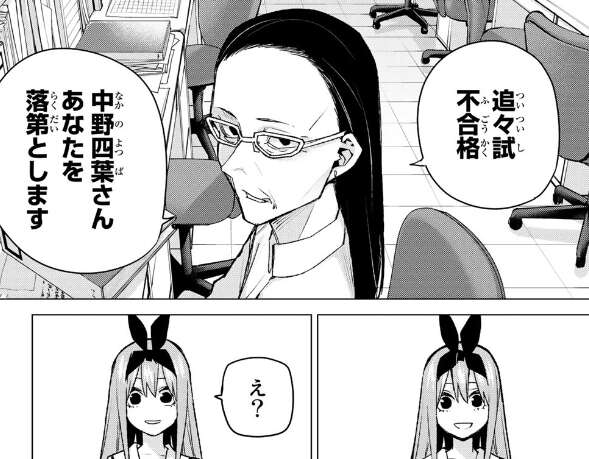 父親から試験を通過したはずだから転校する必要はないと言われますが、二乃はカンニングしたおかげで試験に通過できたと言い、一花、三玖、五月も同じくカンニングペーパーを見せて自分達もだと言います。四葉はなんで私のためにと驚きますが、四人はどこに行くにしてもみんな一緒がお母さんの教えだと言い、私たちは五等分だから困難も五人でなら乗り越えられるよ、と三玖は四葉に優しく言います。