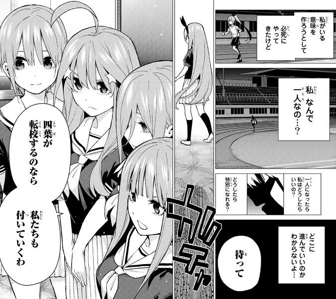 自分だけ転校となり特別の意味や、自分がどこに進んでいいか分からなくなってしまい悩む四葉ですが、そこに一花たち四人が自分達も転校すると言って部屋に入ってきます。