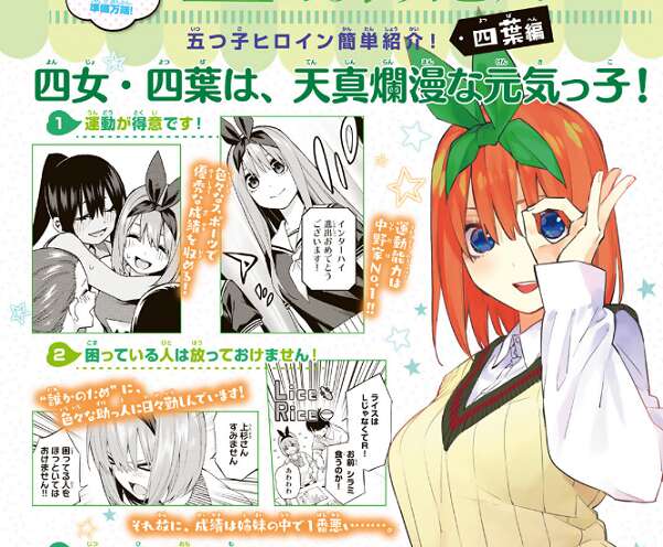 続いて、最終回を一緒に盛り上がろう!記事として、五つ子ヒロイン簡単紹介です。「未読の人はこれさえ読めば大丈夫!」「既読の人もこれを読めば準備万全!」と書かれています。一部、誤解されそうな部分もある気が…。