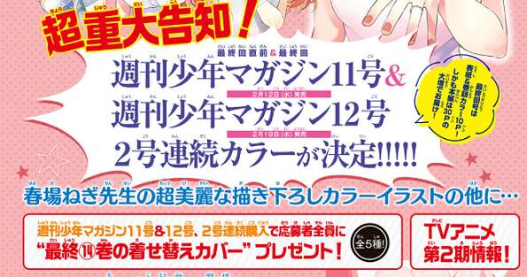 週刊少年マガジン11号&12月の超重大告知として、最終回直前、最終回は2号連続カラーが決定だそうです。さらに最終回号は表紙&巻頭カラー10ページ!で、さらに本編は30ページの大増でお届け!とあります。最終回だからとはいえ、巻頭カラー10ページとは気合入っていますね。さらに30ページでページ数が増えているのも期待できます。さらに応募者全員に最終14巻の着せ替えカバープレゼント企画(全5種、一花、二乃、三玖、四葉、五月バージョン全て集めるには、11号&12号プレゼント応募券を5セット揃える必要ありです・・・、さらにプレゼント応募券は紙媒体限定のようです)や、TVアニメ第2期情報など、情報が盛りだくさんのようで今から楽しみです。