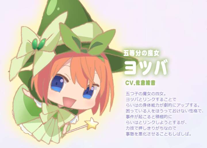 五つ子の魔女の四女。ヨツバとリンクすることでらいはの身体能力が劇的にアップする。#マジカルらいは #五等分の花嫁 pic.twitter.com/XXwzpZwXbW— 『魔法少女マジカルらいは』公式 (@5Hanayome_anime) March 31, 2019