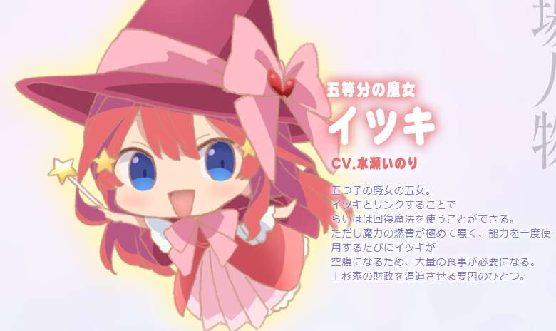 五つ子の魔女の五女。イツキとリンクすることでらいはは回復魔法を使うことができる。#マジカルらいは #五等分の花嫁 pic.twitter.com/Byovf9Goxk— 『魔法少女マジカルらいは』公式 (@5Hanayome_anime) March 31, 2019