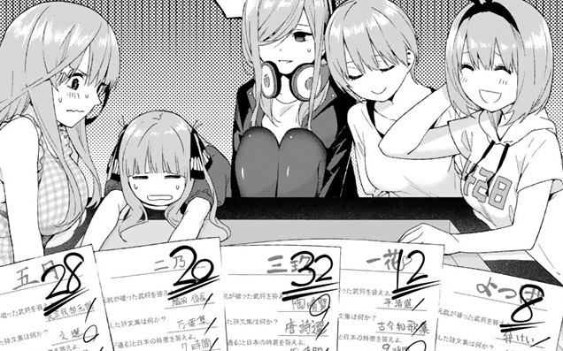 上杉家は借金があるのでお金が必要です。そこに家庭教師のアルバイトの紹介が来ます。風太郎は勉強が得意です(成績は学年1位!)。金持ちの娘とは5姉妹の事です。