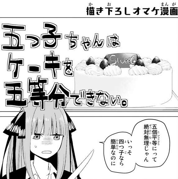 コミック特典として、描き下ろしオマケ漫画がついてます。1巻は1ホールのケーキを5等分しようとしますが、普通に考えると5等分平等に分けるのは難易度が高すぎます。