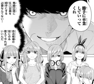 目標は5人の卒業です。馬鹿正直に全員相手にする必要がない事に気づいた風太郎は、テストで合格ラインを超えれば近づかないと提案します。