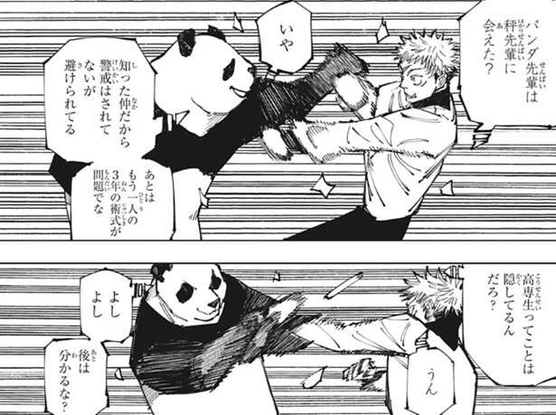 賭け試合が始まると、虎杖とパンダは互角の殴り合いを繰り広げます。殴り合いをしながらも、虎杖とパンダは密かに会話をしてお互いの状況を確認します。パンダは秤にはまだ会えていないようで、星綺羅羅の術式によって避けられているようです。パンダは虎杖が高専生であることを隠していると確認すると、わざと虎杖のパンチをくらいます。