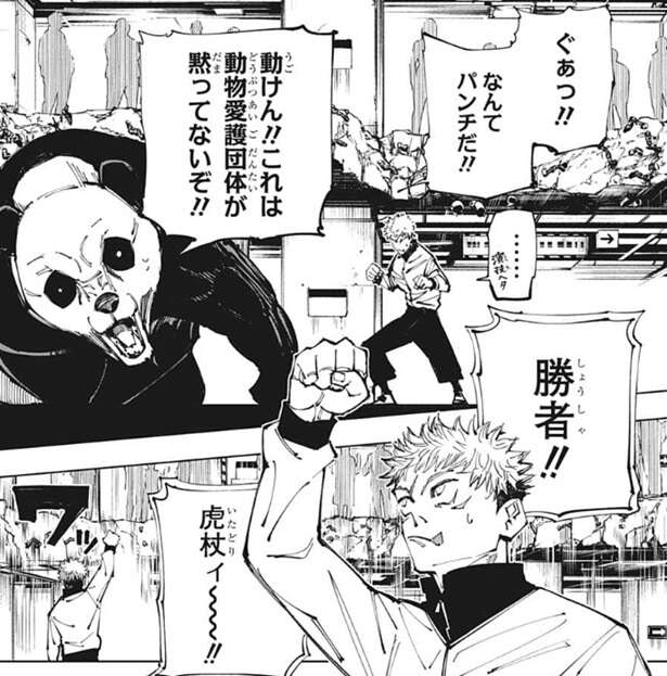 虎杖のパンチをくらい、パンダはわざとらしく苦しみ倒れます。パンダの演技は下手ですが、これ以上戦えないと実況が判断したようで虎杖は試合に勝利します。秤は見張りの男に、トーナメントが終わったら虎杖を屋上に上げるようにスマホで連絡します。