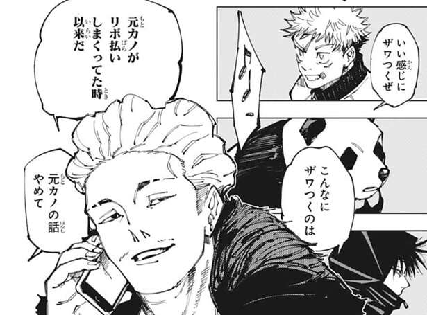 伏黒は引き続き警戒するように指示すると、秤は後で警備に綺羅羅も出すと言います。いい感じにザワつくぜ、こんなにザワつくのは元カレがリボ払いしまくってた時以来だ、と秤つぶやきますが、星綺羅羅は、元カレの話やめて、と文句を言います。
