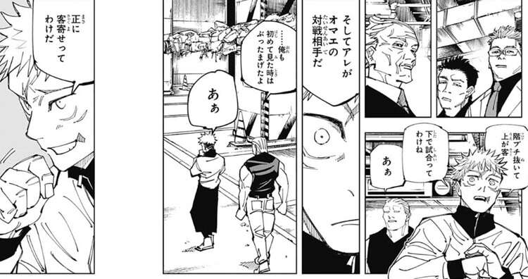 すると、一人の男の方が急に殴ってきますが、寸止めで拳を止めます。賭け試合のルールに「クラブについて口にしてはならない」というのがあるようで、男は伏黒に誰から聞いたか答えるように脅します。伏黒は、名前は知らない、殺したから(嘘)、一月くらい前だ、威勢だけの屑がいたろ、とハッタリをかましますが、一月前にコンドーという男が実際に消えていたようです。さらに伏黒がハッタリをかますと、ボスから許しが出たと言い、シード枠として賭け試合に出場させてもらえることになります。ただ、出場するのは伏黒でなく虎杖となり、伏黒は駆け引きをしつつ虎杖が賭け試合に出場する事を受け入れます。