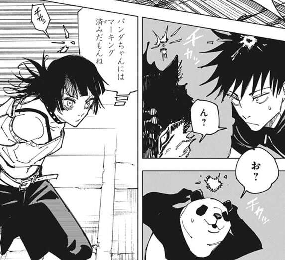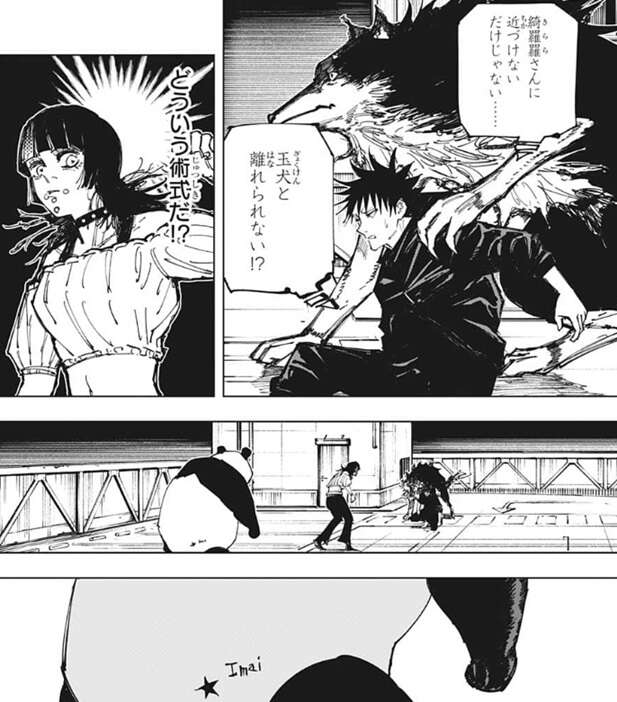伏黒は玉犬と離れられないようになっていると推測しますが、星綺羅羅の術式がどんなものなのか、まだ全体を把握できておらず、伏黒はこの状況に困惑します。その時、パンダのお尻の辺りに★マークと「Imai、イマイ」と描かれている場面が映ります。おそらくこれも星綺羅羅の術式が関係しているのでしょうが、詳細は不明です。