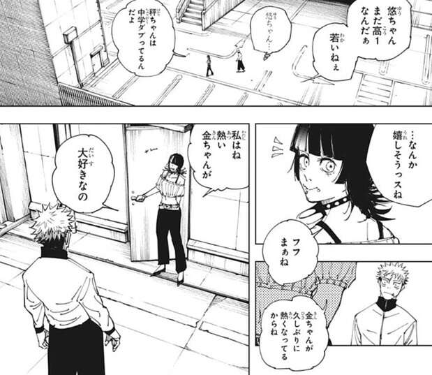 ちなみに賭け試合トーナメントの方は、あっさりと虎杖の優勝で終了していました。優勝できたので、虎杖の方は秤に会うチャンスを得たようです。虎杖は星綺羅羅の案内で地下駐車場の屋上へと向かっていました。星綺羅羅が嬉しそうにしているので虎杖がそれを聞くと、星綺羅羅は秤が久しぶりに熱くなっているからだと答え、私はね、熱い金ちゃんが大好きなの、と虎杖に話します。