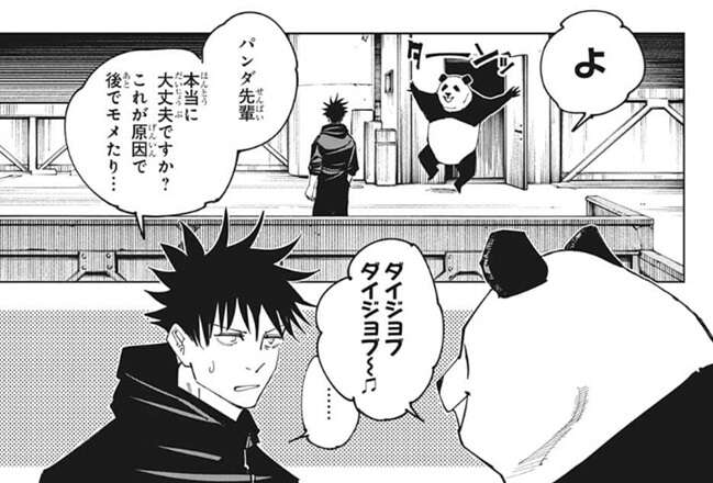 伏黒は防犯カメラの死角になる場所で見張りを倒し、パンダは愛らしさをアピールして防犯カメラの死角になる所まで見張りをおびき寄せて一気に倒します。