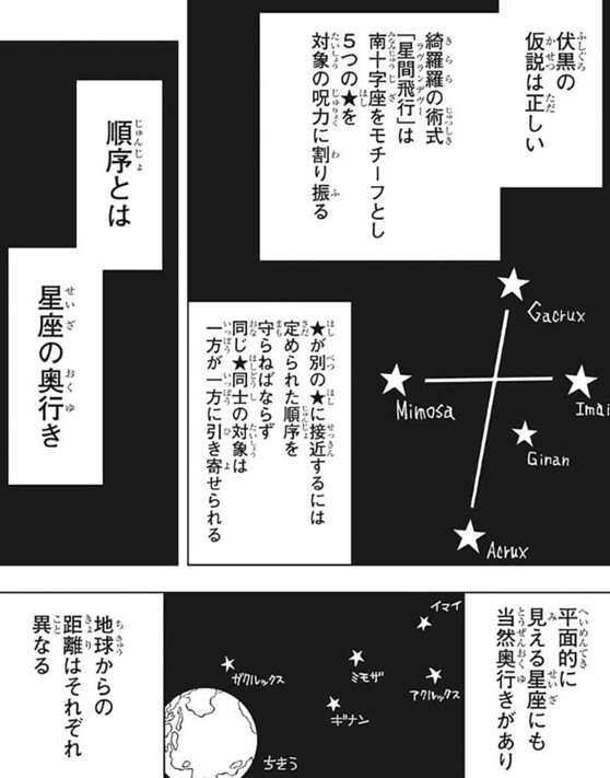 伏黒の仮説は正しく、星綺羅羅の術式「星間飛行(ラヴランデヴー)」は五つの★を対象の呪力を割り振り、★が別の★に接近するには星座の奥行の順番通りに経由しないと、反発して近づけないようです。また、同じ★同士の対象は一方が一方に引き寄せられるようです。この法則でいくと、星綺羅羅により「AcruX、アクルックス」を付けられた伏黒が、扉に到達するには、「Mimosa、ミモザ」、「Ginan、ギナン」を経由しなければいけないようです。