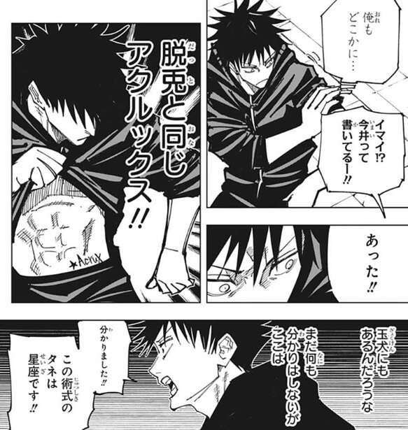 イマイ!?今井と書いている、とパンダが伏黒に返事をすると、何か確信したようで、伏黒は自分の体を確認し、自分の体、腹の辺りにも「AcruX、アクルックス」と書かれている事を確認します。まだ伏黒は星綺羅羅の術式の事はほとんど分かっていないようですが、あえて星綺羅羅の術式のタネが星座にある、とパンダに叫んで伝えます。