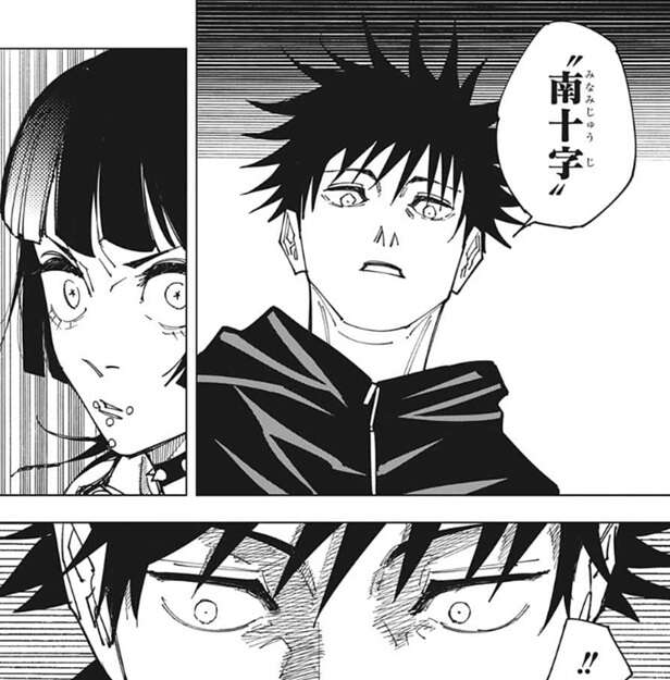 そして伏黒が、モチーフの星座は……“南十字”、と言うと、星綺羅羅は「マジか」という顔をしてしまいます。伏黒も星綺羅羅の術式のモチーフが南十字星という確信はなかったようですが、星綺羅羅の「マジか」という顔を見て確信したようです。術式のモチーフの星座が“南十字星”という事は分かりましたが、伏黒は南十字星の星は4つだと思っており、パンダにも南十字星の星の数について確認します。しかし、パンダも星座には詳しくないようで、え…そりゃ十字だし…、という返事をします。ちなみに、伏黒とパンダは★マークと文字を書かれていますが、二人は近付けるようです。