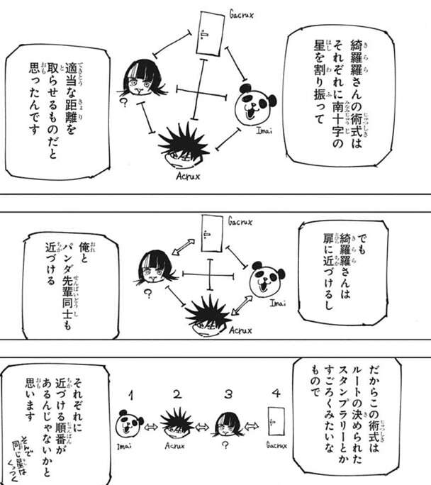 伏黒は最初、星綺羅羅の術式はそれぞれに南十字星の星を割り振って、適当な距離を取らせるものだと考えます。しかし、星綺羅羅が扉に近づけたり、伏黒とパンダが近づける状況からこの考えは違っていたようです。そこでこの術式はルートの決められたスタンプラリーのようなもので、それぞれに近づける順番があるのでは、と伏黒は考えます。