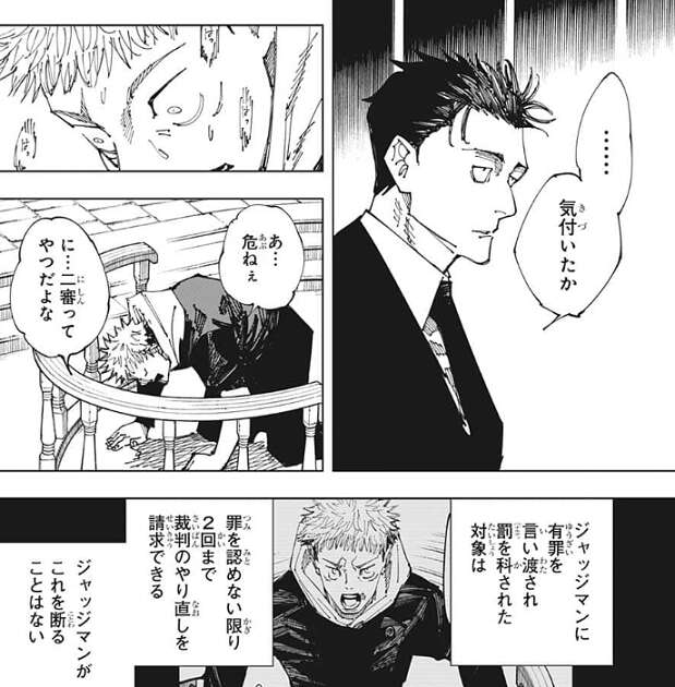 虎杖は日車の術式が裁判の術式なのに気付き、裁判のルールを利用して日車にある提案をします。