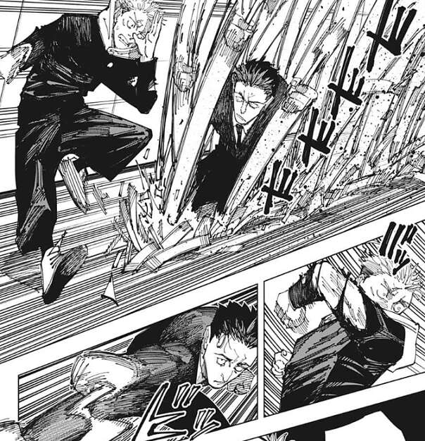 日車は虎杖と話しつつ、虎杖が呪力なしで自分と対等に渡り合えている事に驚愕します。虎杖が呪術師としてではなく生来の肉体、生物としての強度が恐ろしく高いことに日車は気付きます。また術師は術式が使用できなくなると、長年の勘が鈍るのか基礎的な呪力操作もグダグダになることが多かったようですが、虎杖がそれより不利な、完全な呪力の使用不可の状態で、これだけ自分と戦えている事実に脅威を感じ、日車は虎杖を全力で潰す決意をします。