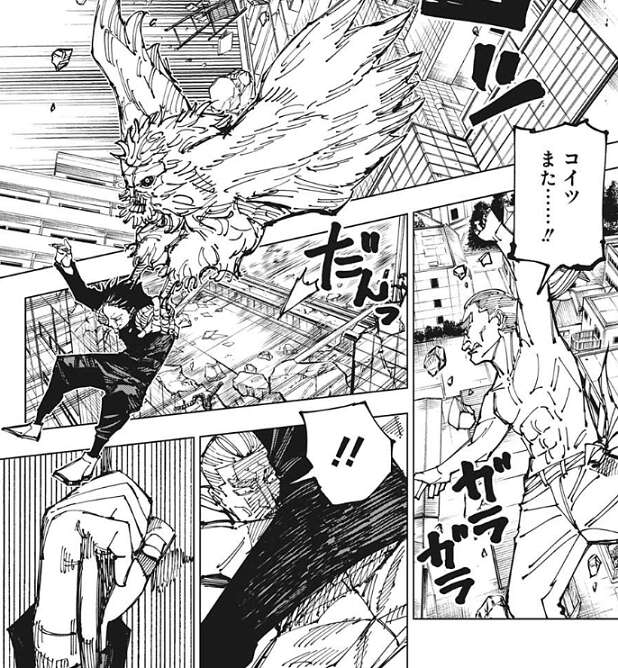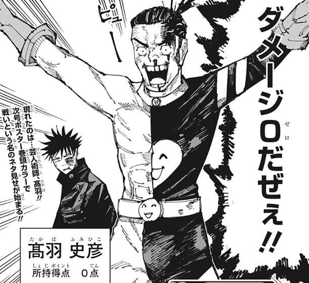 伏黒が躊躇している隙に、黄櫨は再び自分の歯を使用して、爆発を起こします。今度こそ伏黒は爆発をくらってしまいそうになりますが、何者かが伏黒を爆発から護ります。レジィ、黄櫨、伏黒の三人が突然の乱入者に驚いていると、2対1で本当に公平なのかい?君達のような人間は卑怯者だ、卑怯者の攻撃は効かん……!!と、啖呵を切ると、ダメージゼロだぜぇ!!と、叫びます。しかし、頭部から結構な量の出血があり、どうみてもダメージゼロではありません。乱入者は芸人術師・髙羽史彦で、以前の回で芸人として劇場に立っている様子が描かれていました。伏黒も髙羽の言動にあきれていますが、髙羽は伏黒の味方となるのでしょうか?
