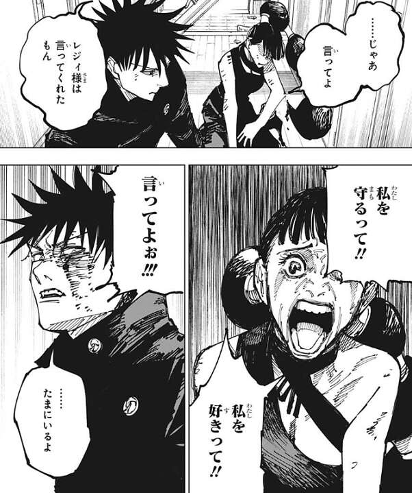 伏黒は麗美に、これで分かったろ、アイツらオマエを守る気なんてないぞ、と言い、麗美にここから去るように忠告します。しかし、それでも麗美は伏黒を背中から攻撃し、伏黒もさすがにキレて、大概にしろよ、と怒ります。しかし、麗美は伏黒がキレている事も無視して、私を守るって!!私を好きって!!言ってよぉ!!!と、伏黒に逆ギレします。そんな麗美を見て、伏黒は麗美の事をクズ人間と言って、麗美の事を露骨に蔑みます。