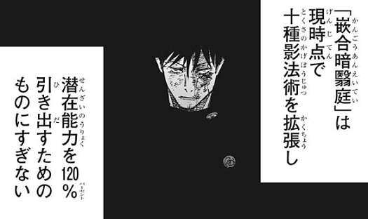 伏黒の領域は未完成で、必中の術式は付与されておらず「嵌合暗翳庭」は現時点で十種影法術を拡張し、潜在能力を120%引き出すためのものにすぎません。そのためレジィの彌虚葛籠で術式の必中効果を無効化しても、意味がありませんでした。