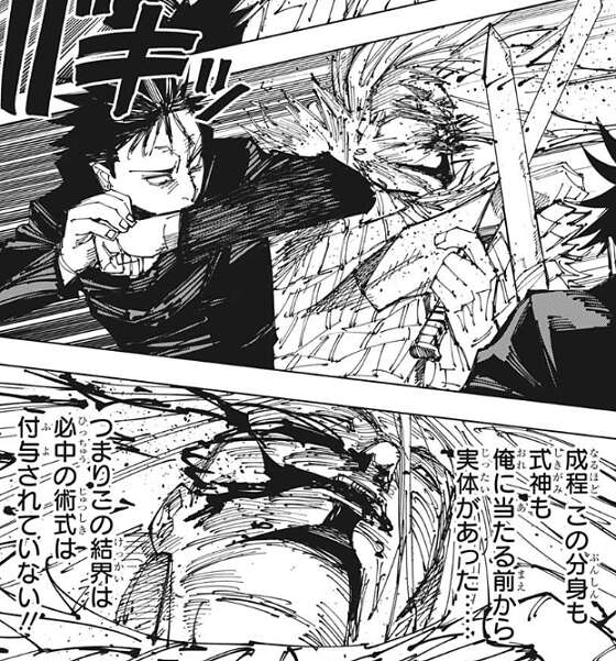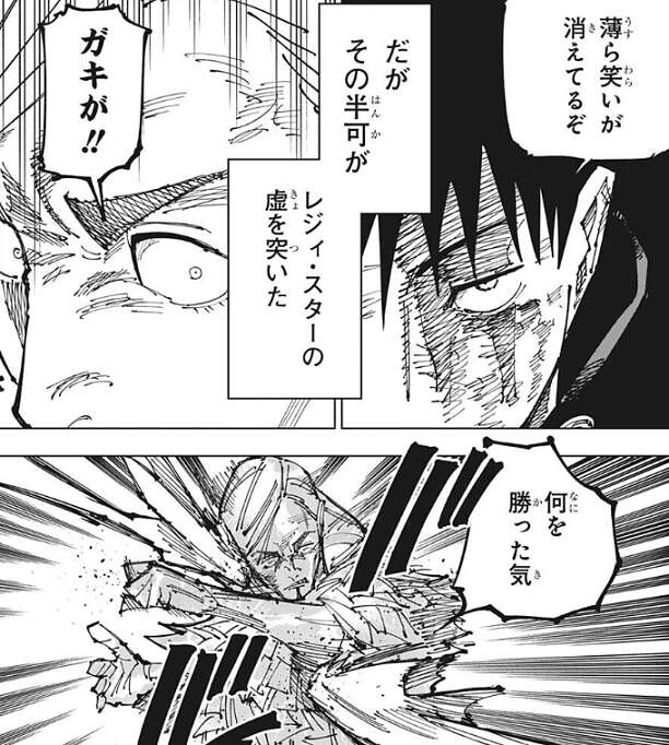 伏黒の領域が未完成と知らないレジィにとっては虚を突かれた形となり、薄ら笑いが消えてるぞ、と伏黒が言うとレジィは激怒して言い返そうとしますが、言い返している途中で影から出てきた式神や伏黒の分身による連続攻撃がレジィを襲います。