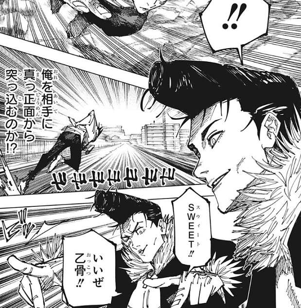 乙骨は真正面から石流に突っ込んでいきます。石流も特攻してくる乙骨に気分を良くし、再び髪からビームのようなものを発射します。